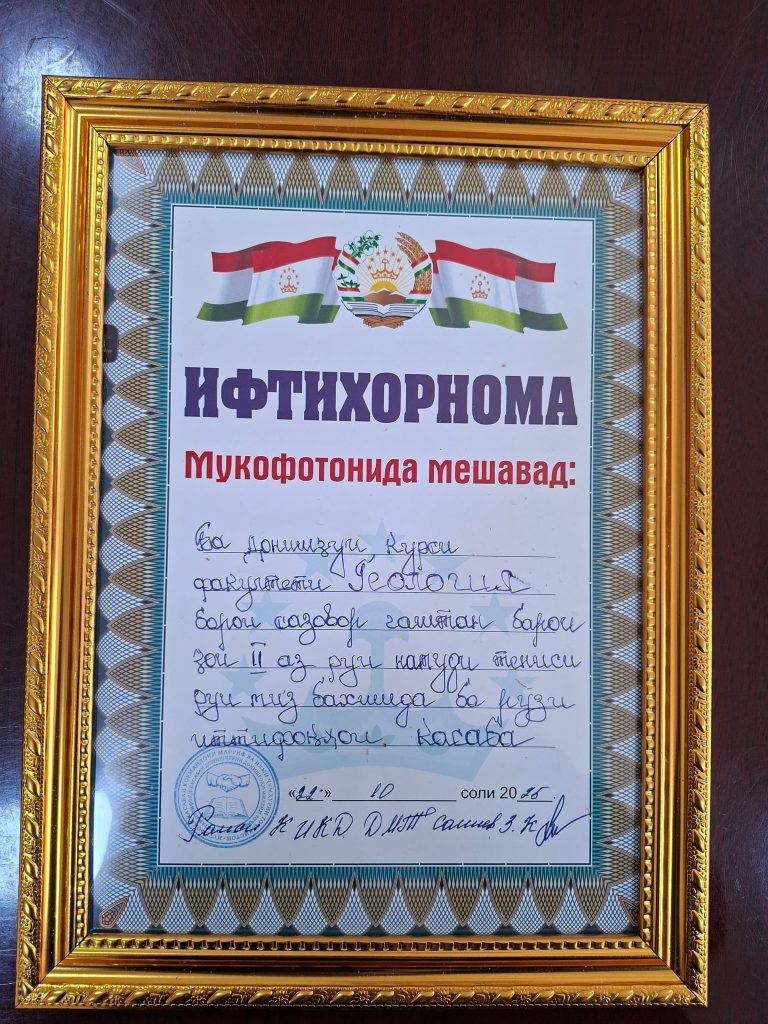 Дастаи донишҷӯёни факултет бо иштироки донишҷӯён Назарбеков Некрӯз Дилдорбекович ва Давлатназаров Асрор Ақназарович фаъолияти хуб нишон дода аз рӯйи натиҷа сазовори ҷойи 2-юм гардиданд ва аз ҷониби раёсати Донишгоҳи миллии Тоҷикистон бо ифтихорнома ва туҳфаҳои хотиравӣ ҳавасманд карда шуданд.Ба ин муносибат садорат, устодон, кормандон ва донишҷӯёни факултет дастаи донишҷӯёнро табрик мамоянд.