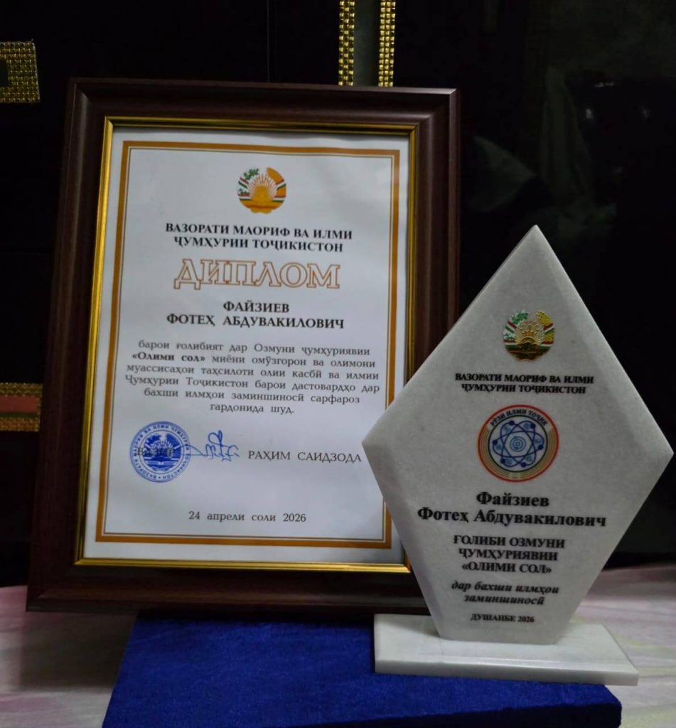 Санаи 24-уми апрели соли 2026 дар Кохи Суруш бо ибтикори Вазорати маориф ва илми Ҷумҳурии Тоҷикистон озмуни ҷумҳуриявии “Олими сол” миёни омӯзгорон ва олимони муассисаҳои таҳсилоти олии касбӣ ва илмии Ҷумҳурии Тоҷикистон баргузор гардид, ки дар он доктори илмҳои геология ва минералогия, дотсенти кафедраи геология ва менеҷменти маъдану техникаи факултети геологияи Донишгоҳи миллии Тоҷикистон Файзиев Фотеҳ Абдувакилович дар соҳаи заминшиносӣ соҳиби ҷоизаи “Олими сол” гаштанд.